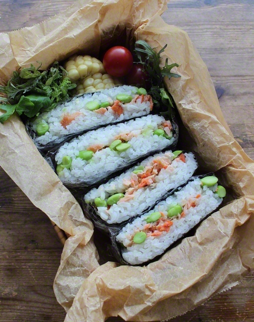 のり、ご飯、具、ご飯……と食材を重ねて包むプロセスに、工作のような楽しさがあるおにぎらず。サンドイッチのように両手で持ってパクッといただきます。おにぎりでおなじみの鮭マヨもおにぎらずの形になると、まったく別のお料理のように感じるから不思議です。鮭をツナにしたり、青しその千切りをプラスしてみたり……具のアレンジで新しいおいしさを発見するのも楽しいです。