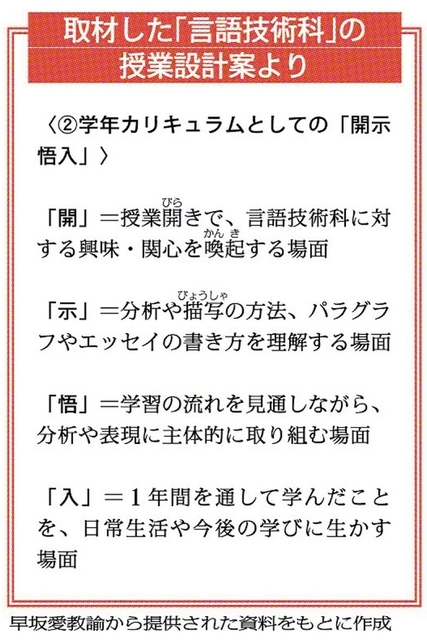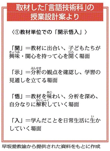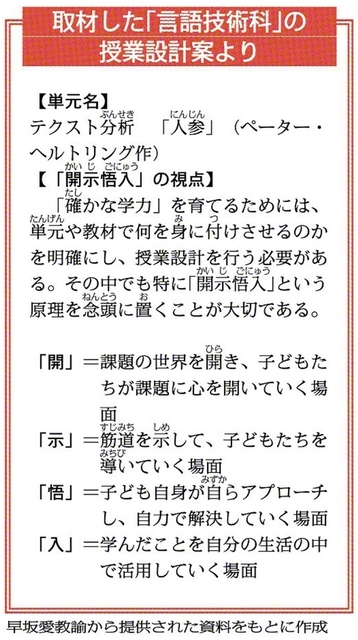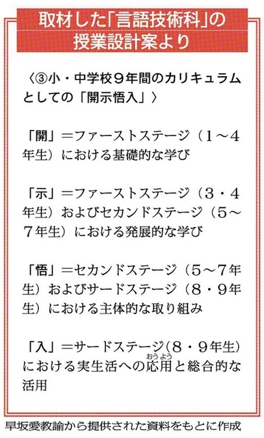 今回の授業を担当する早坂愛教諭は、同校の教務部長だ。長年にわたり、「開示悟入」をもとに授業を組み立ててきた。事前に授業設計案を見せてもらう。「教材」にとどまらず、「学年」「小・中学校9年間」にまで展開されていることに驚いた。