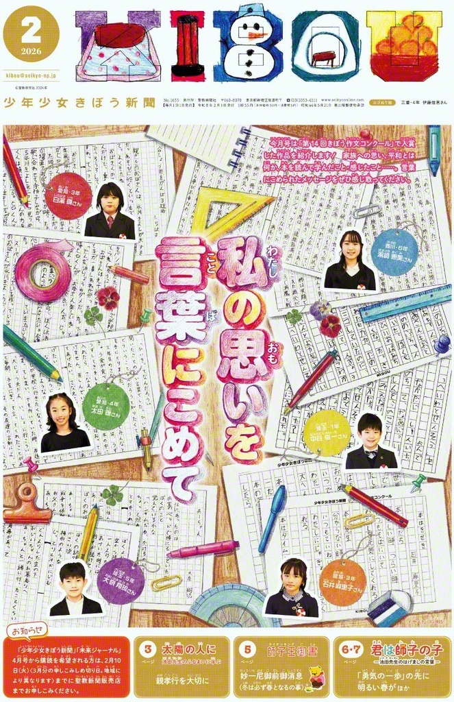 小学生向けの「少年少女きぼう新聞」の「君は師子の子――池田先生のはげましの言葉」では、「感謝の心から『挑戦』は始まる」などをテーマに、珠玉の指針を紹介。創価後継の友の激励に活用していきたい。