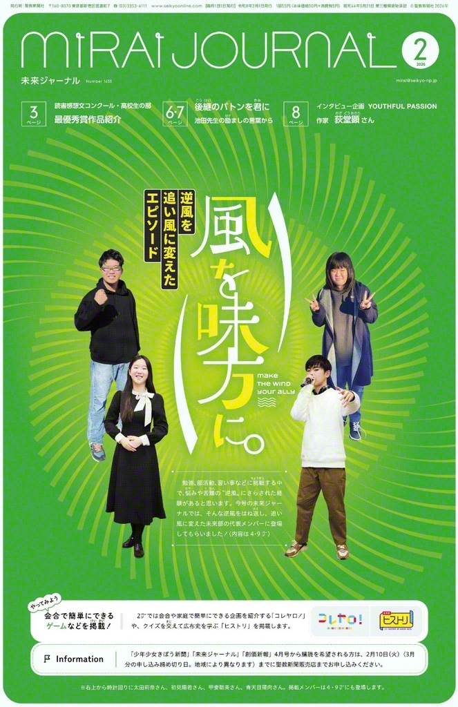 中学・高校生向けの「未来ジャーナル」は「後継のバトンを君に――池田先生の励ましの言葉から」を掲載する。「みんながみんな、いっぱいの可能性を秘めている」などをテーマに、先生のエールを届ける。