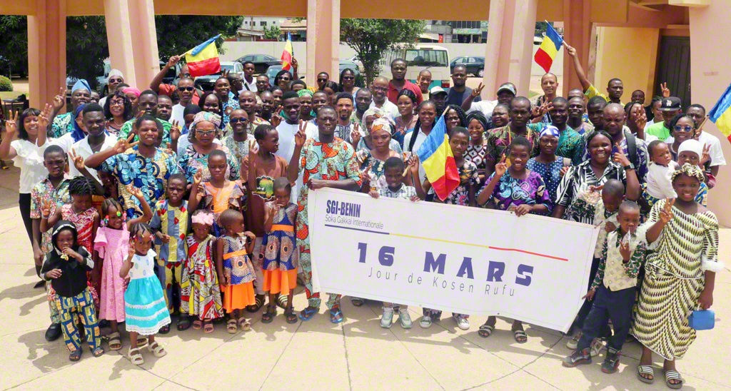 ベナンの大会は同日、中心都市のコトヌーで行われた。ダ・フォントン青年部長のあいさつに続き、皆で「大白蓮華」3月号の巻頭言を確認。青年部の代表による「3・16」の研究発表に続き、寸劇やダンスなどが披露され、ムース支部長が友を励ました。