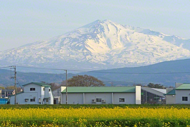 由利本荘市西目地区にある道の駅「にしめ」付近には、広大な菜の花畑が広がっています。今月14日に撮影した鳥海山や桜並木との共演をご覧ください。