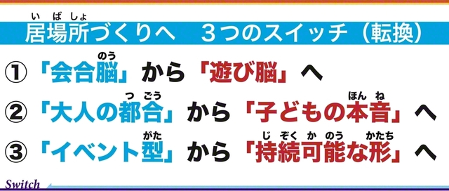 皆の思いが一致します。「『地域の子どもたちが行きたくなる会館』『子どもを“まんなか”にして全ての世代がつながる居場所』をつくりたい」。そのために、三つの意識のスイッチ(転換)を図りました。