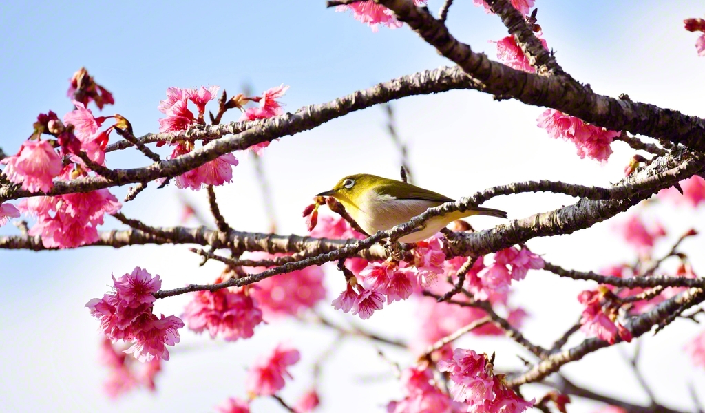 一足早い春の訪れを知らせるように、沖縄・本部町の八重岳のヒカンザクラが開花した。花の蜜を求めてか、メジロがやって来た。同町では、あすから“日本一早咲きの桜まつり”が開催される。