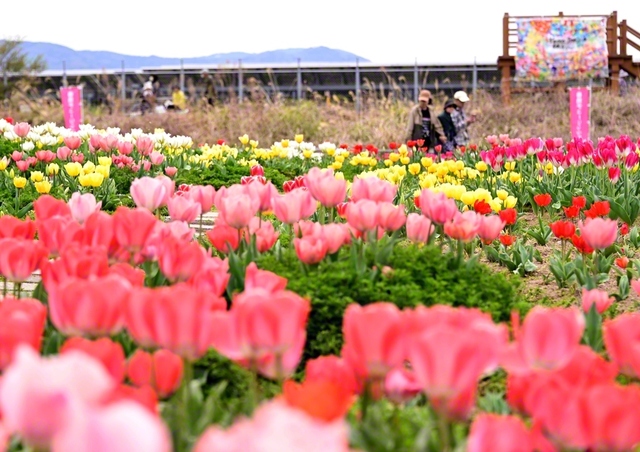 長崎港の入り口にある香焼町で、色鮮やかなチューリップの花々が満開に。 畑から海岸の方へ目を移すと、そよ風に揺れる「折り紙アート」があった。3月20日に行われ…