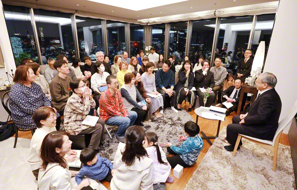 原田会長が駆け付け、師弟共戦を約し合った東京の中央区・長者地区の座談会。高等部の広原ねおさん、女性部の高野伸子さんが「大白蓮華」の巻頭言を朗読した(中央区内で)