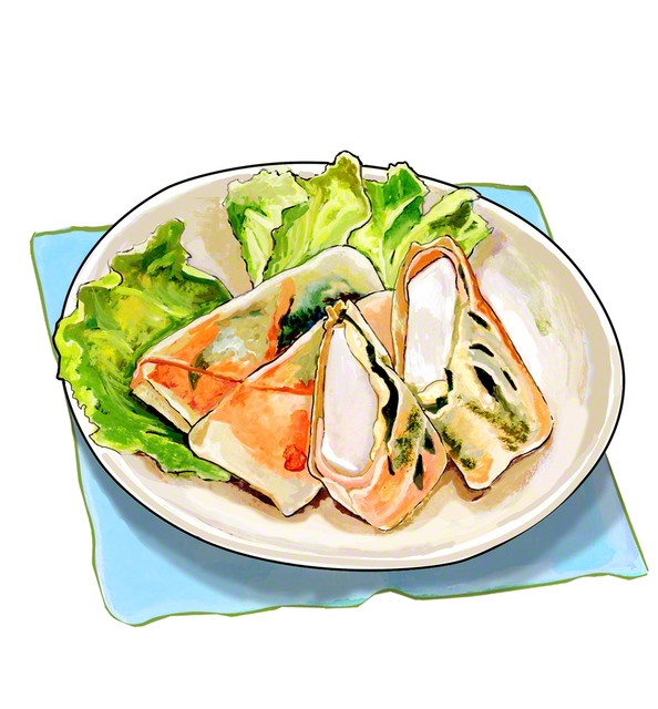・はんぺん 1枚半 ・ハム 3枚 ・スライスチーズ 3枚 ・春巻きの皮 6枚 ・大葉 6枚 ・サラダ油 大さじ2 ・水溶き小麦粉(水1:小麦粉1)…