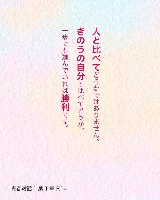 人と比べてどうかではありません。きのうの自分と比べてどうか。一歩でも進んでいれば勝利です。 青春対話1 第1章 P14