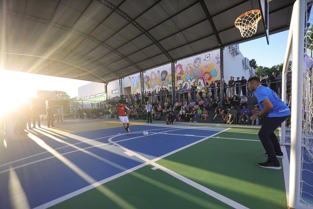 開館を記念したサッカーのPK対決に、コート脇の青年から大きな声援が飛ぶ。赤・黄・青の三色カラーの鮮やかなコートと、約100席の観客席を備えた会場は、多くの笑顔で埋め尽くされていた。