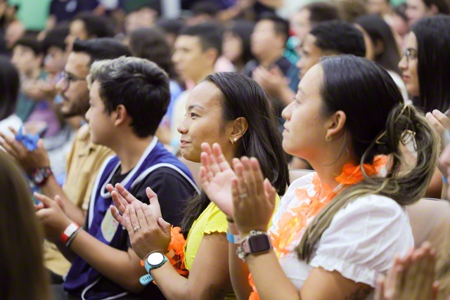 喜びが爆発した開館式。師と共に人間革命へ挑む青春を誓った(3月13日、ロンドリーナ創価ユース文化会館で)