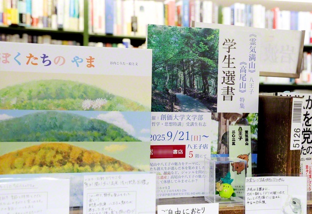 高尾山に関連した書籍を扱う「学生選書コーナー」で、携わった創価大学生が本を手に。昨年9月から先週末まで実施され、好評を博した