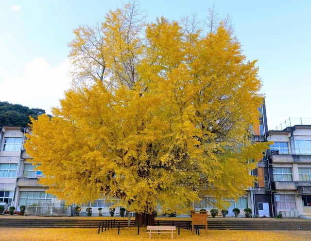 南伊勢町の旧・穂原小学校の校庭に堂々とそびえる、推定樹齢約400年の「大銀杏」。町指定の天然記念物に登録され、迫力満点のたたずまいを見物客が写真に収めていた。