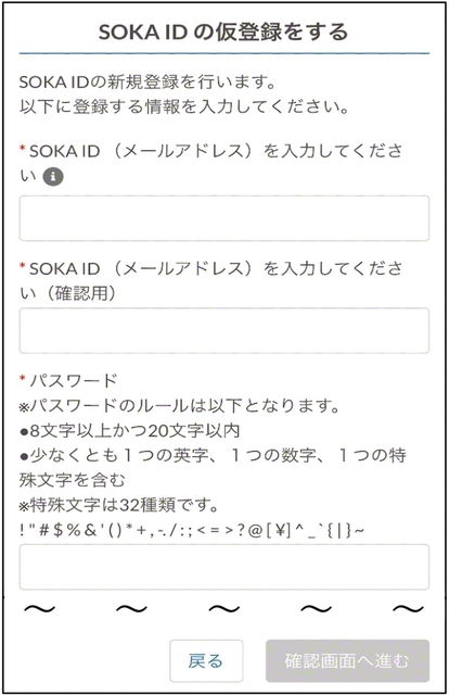 SOKA IDの「仮登録」をし、「本登録のご案内」のメールのURLを選択し、本登録を完了します。