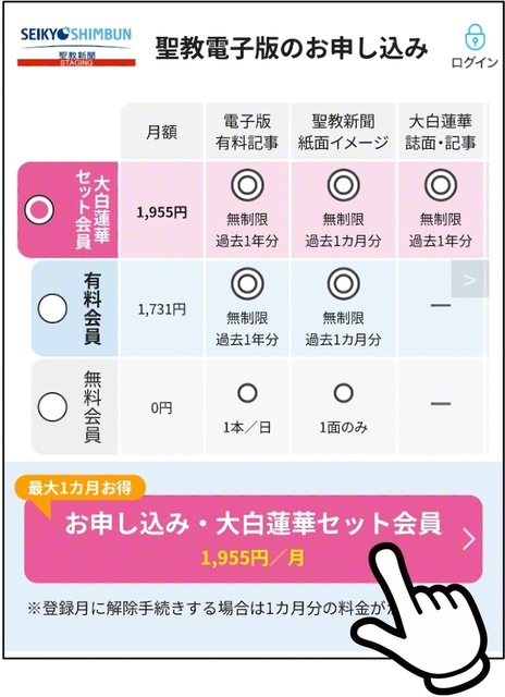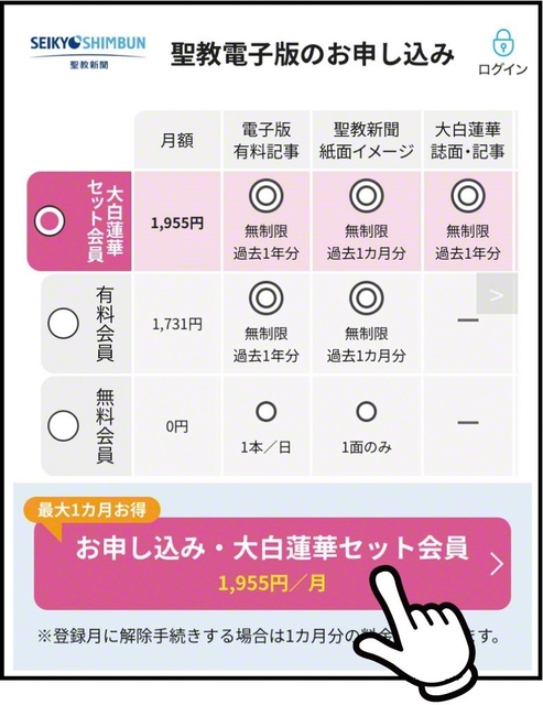 聖教電子版の「大白蓮華セット会員」が好評です。ここでは、大白蓮華セット会員へのプラン変更・新規登録の流れ、登録時の注意事項などを紹介します。「誌面イメージ」は発刊月の前月23日前後に公開されます。大白蓮華セット会員の利用料は月額1955円(税込み)です。