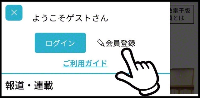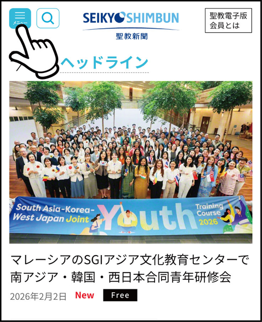 聖教電子版WEBサイトのトップページ左上の「メニュー」から「会員登録」を選択します。