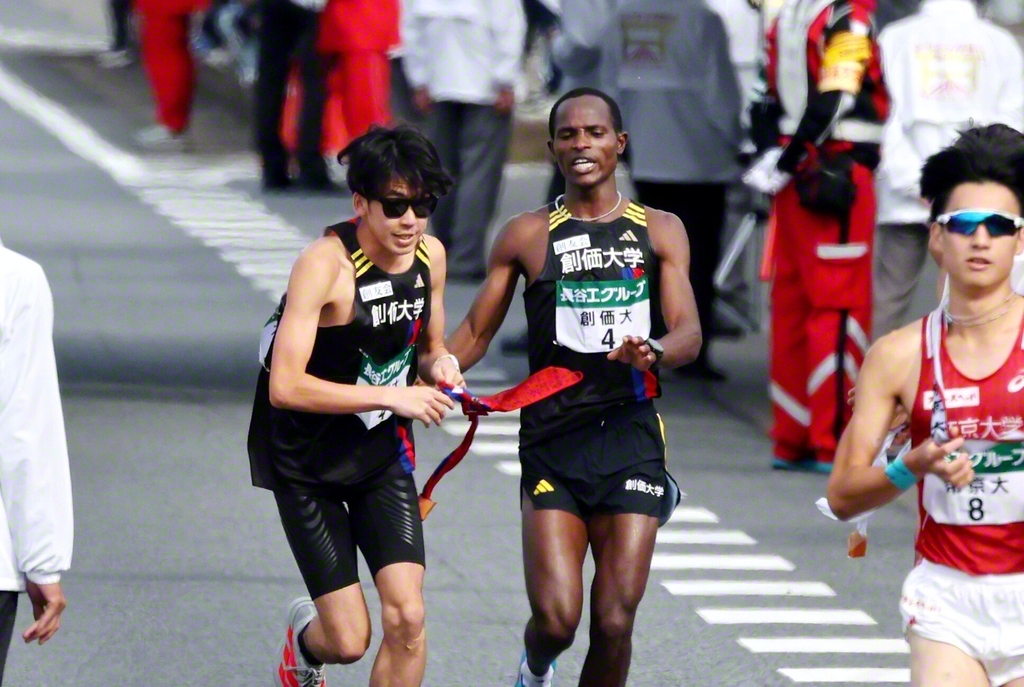 タスキを受けたスティーブン・ムチーニ選手(3年)は、落ち着いた表情でスタート。気温も徐々に高くなる中で安定したペースを維持し、先頭の背中が見える位置で中継所に飛び込んだ。