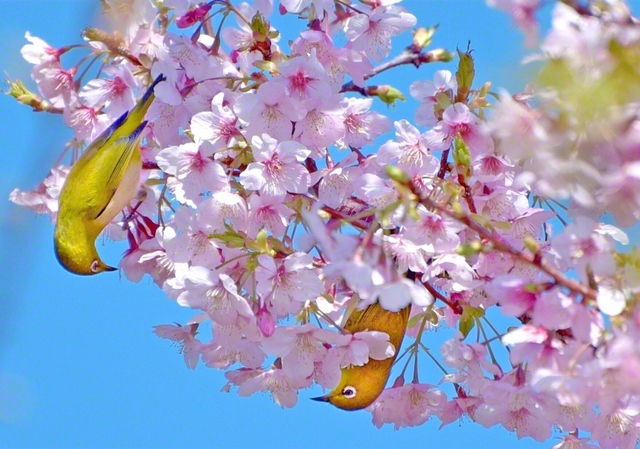 河津桜の枝から枝へ飛び回る2羽のメジロ。仲睦まじくさえずりながら、花の蜜を求める姿が、ほほ笑ましい。 躍動の春が到来! 栄光の「5・3」へ心軽やかに進みたい…
