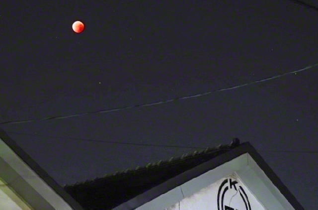 8日未明、約3年ぶりの皆既月食が起こり、“赤銅色”の月が土佐の空に浮かんだ(高知市内で勝賀瀬泰司通信員撮影)。 光り輝く満月のように、信心強く所願満足の人生…