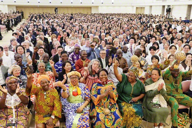これには原田会長、長谷川理事長、那須女性部長らが、各部と各方面・県の代表、来日した海外75カ国・地域の代表270人と共に出席。