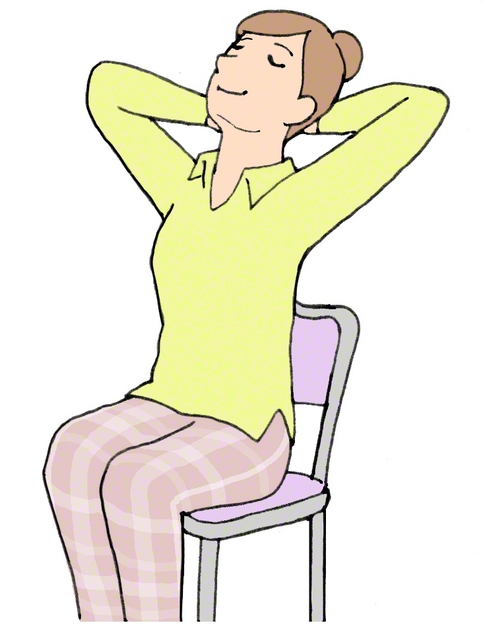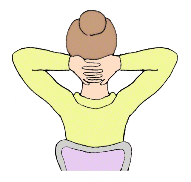 背もたれのあるイスに深く座る。両手を頭の後ろに回し、後頭部と首の上部の境目あたりで両手を組む。