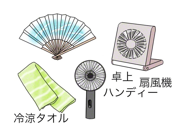 電気が使えない状況に陥った場合は、冷涼タオルを首に巻いて、乾電池式のハンディー扇風機、もしくは扇子などで風を送る方法があります。ある程度、体温を下げることができるでしょう。
