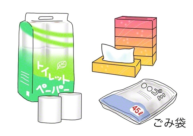 日用品はトイレットペーパーやティッシュペーパーが必要でしょう。さらに、ごみ袋が非常時には、水タンク代わりになるなど、何かと活躍しますので多めに備蓄してください。