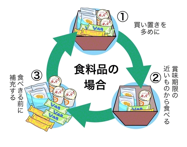 食料品・飲料水・日用品・消耗品は日常備蓄(ローリングストック)が有用です。例えば、食べ物であれば、生もの以外の買い置きを多めにして、賞味期限が近いものから食べて、食べきる前に補充するというもの。いずれ食べるので、防災備蓄用の予算も必要ありません。