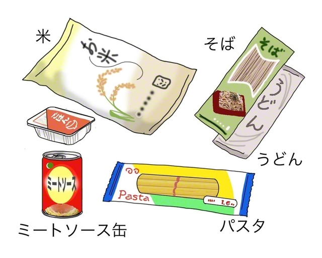 おすすめの食材は、主食としては、お米と乾麺です。乾麺は賞味期限が比較的長くて最適です。レトルトのカレーや牛丼の具をご飯にかけたり、レトルトのミートソースをパスタにかけたりすれば、生き延びていけます。