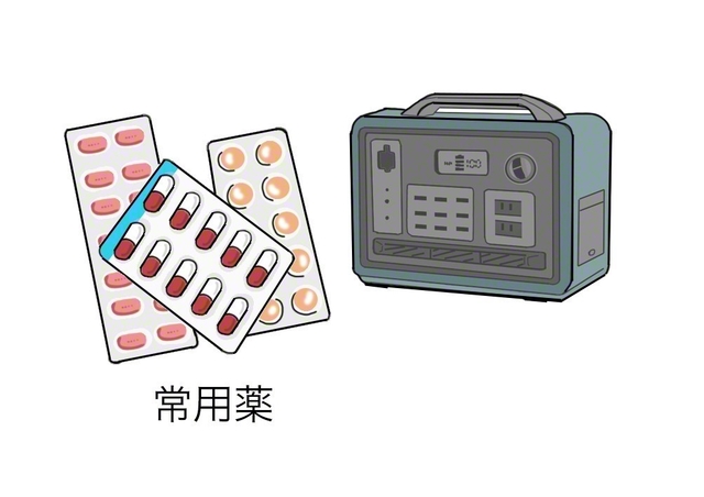 自分やわが家にとっての必需品の備えは必須です。まずは、眼鏡やコンタクトレンズ、補聴器やつえ、医療機器など、身体機能の一部となっているものです。また、常用薬の備え(7日分程度)、在宅用の医療器具を使っている場合は、停電に備え、ポータブル電源などの予備電源を用意しておきましょう。