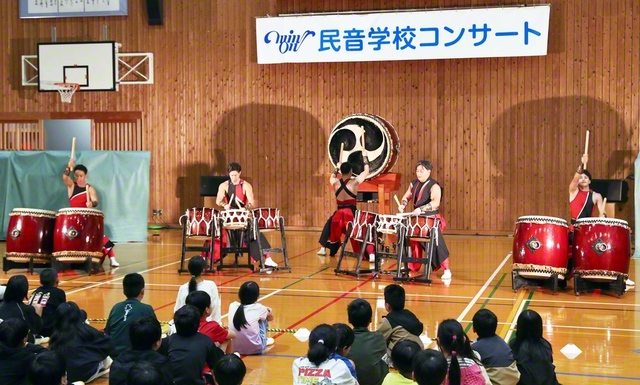民音主催の「学校コンサート」が21日、徳島・佐那河内村の佐那河内小学校・中学校で行われ、同校の児童・生徒らが参加した(写真)。 和太鼓グループ「舞太鼓あすか組」が迫力の演奏を披露。和太鼓演奏を体験するコーナーでは、児童・生徒らが、ばちを手に力強いリズムを響かせた。