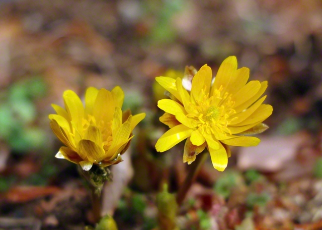 道端に福寿草が咲いていました(6日、八戸市内で撮影)。花言葉は「幸せを招く」です。