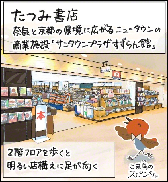奈良の書店の魅力を、こま鳥のスピンくんが紹介します。 ◇ たつみ書店=サンタウンプラザすずらん館(奈良市右京1の3の4)2階 開店時間=午前10時~午…