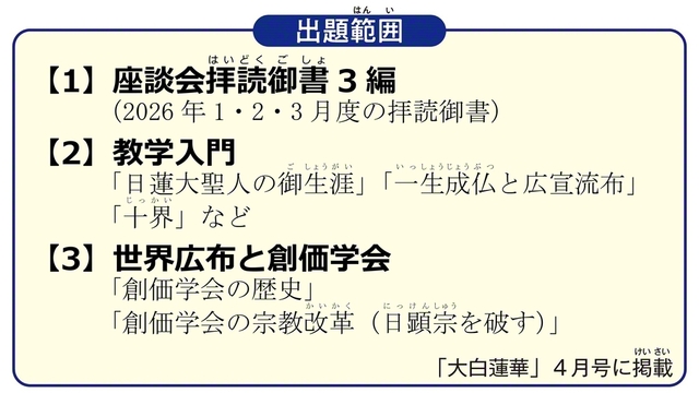 ※出題範囲は別掲。研さんに当たっては、御書新版・御書全集のいずれも可。
