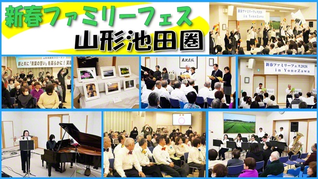 山形池田圏の「新春ファミリーフェス2026 in YoneZawa」が11日、米沢文化会館で開催された。 ファンファーレでスタートし、未来部の代表がにぎやか…