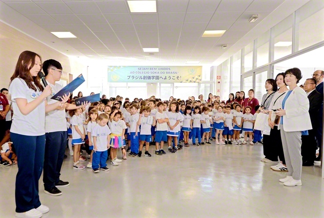 那須SGI女性部長、堀口同女子部長が16日、サンパウロ市のブラジル創価学園を訪れ、学園生や教職員とにぎやかに交流した。同学園は2001年6月6日に開園し、本年で創立から25年を迎える。