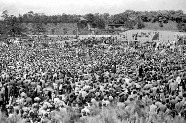 こうした社会の混乱、とりわけ食糧難に対して、昭和天皇はGHQのマッカーサー最高司令官に、皇室の所蔵品を贈る代わりに、国民への食糧援助を求めている。46年5月19日の食糧メーデーには、25万人が皇居前広場に押し寄せ、事態の解決を訴える。この時、日本共産党員の一人が「朕はタラフク食ってるぞ ナンジ人民飢えて死ね」などと書いたプラカードを掲げ、不敬罪で逮捕されるという事件が起こった。24日、昭和天皇は、玉音放送以来となる放送を行い食糧難克服を国民に呼びかけた。戦後の混乱期の中、民衆は必死に生き抜かねばならなかった。